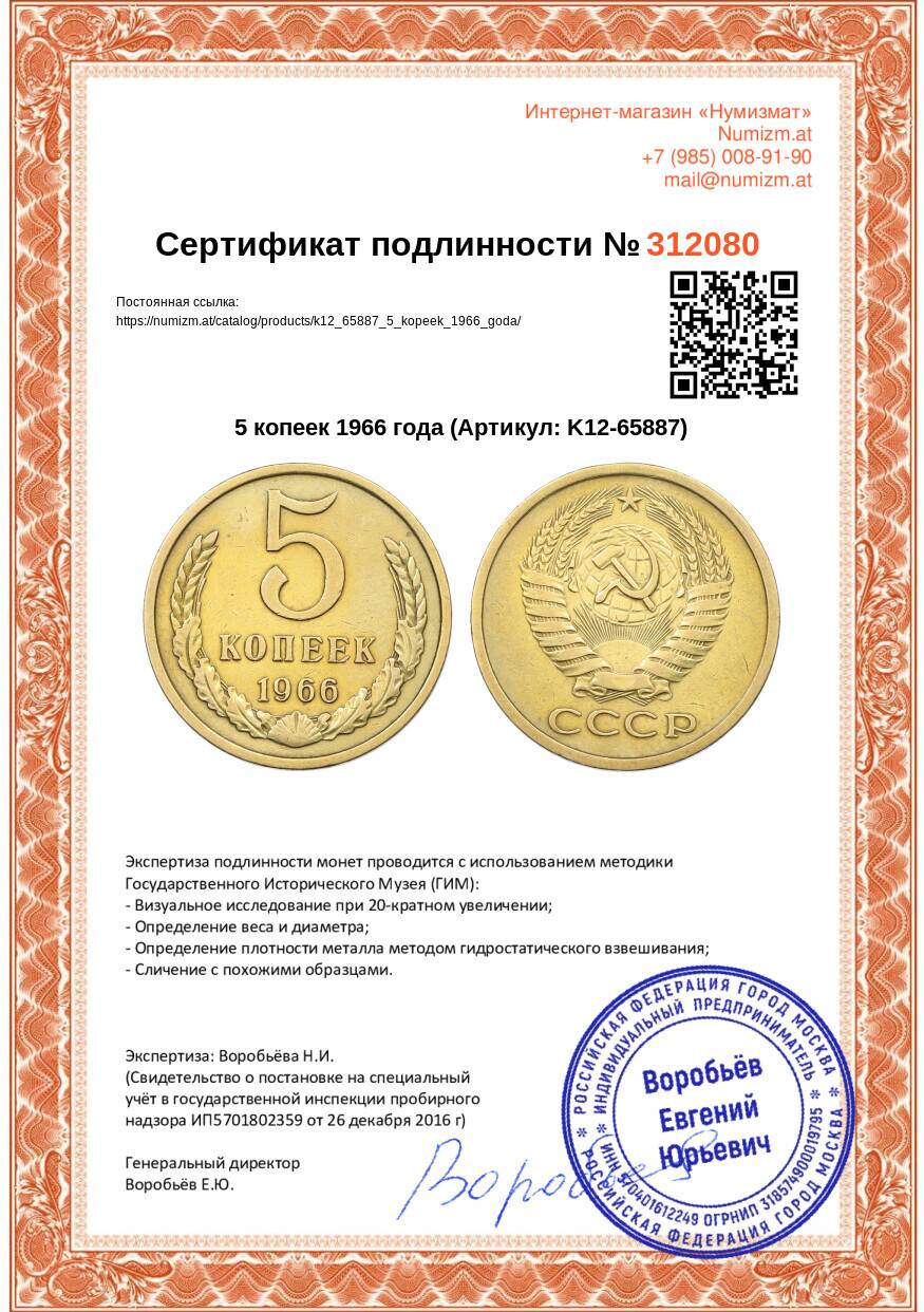 20.01.2025Интернет магазин «Нумизмат» предлагает приобрести 5 копеек 1966 года.