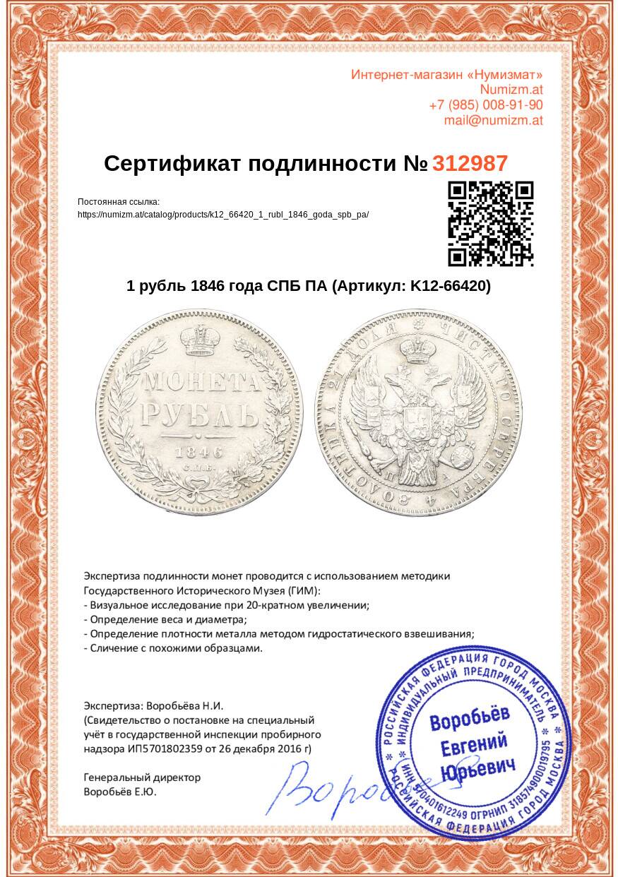 20.01.2025Интернет магазин «Нумизмат» предлагает приобрести 1 рубль 1846 года СПБ ПА.