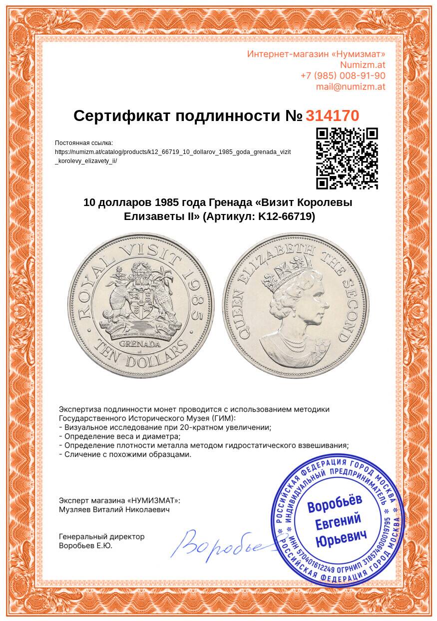 Купить 10 долларов 1985 года Гренада «Визит Королевы Елизаветы II» по привлекательной цене можно в нашем интернет-магазине — Вам достаточно оформить заказ на сайте. Все монеты, представленные в каталоге, находятся в наличии на нашем складе.
