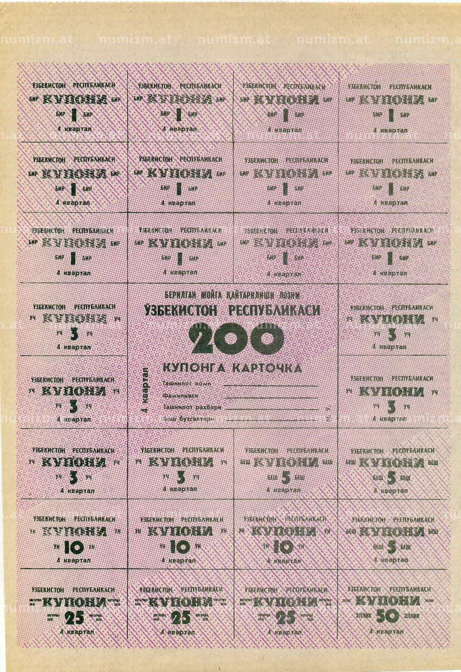 20.01.2025Интернет магазин «Нумизмат» предлагает приобрести Карточка на 200 купонов 1992 года Узбекистан.
