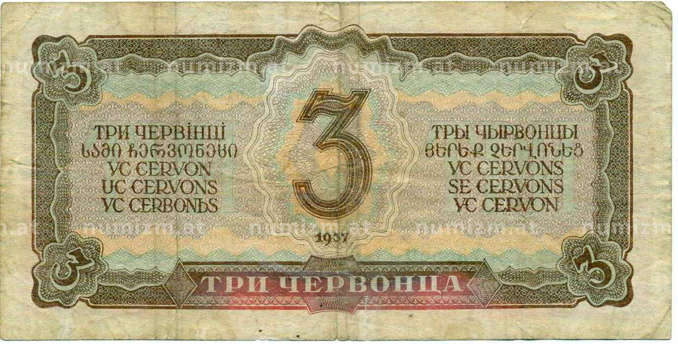Банкнота 3 червонца 1937 года (Артикул: K12-71772): подробные характеристики, качественные фотографии в высоком разрешении, низкая цена.