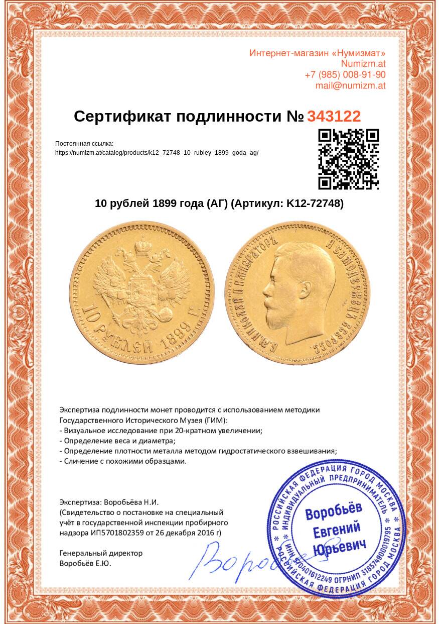 20.01.2025Интернет магазин «Нумизмат» предлагает приобрести 10 рублей 1899 года (АГ).