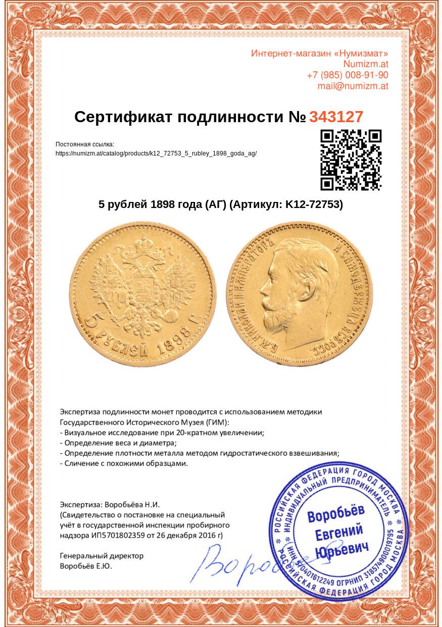 Монета 5 рублей 1898 года (АГ) (Артикул: K12-72753): подробные характеристики, качественные фотографии в высоком разрешении, низкая цена.