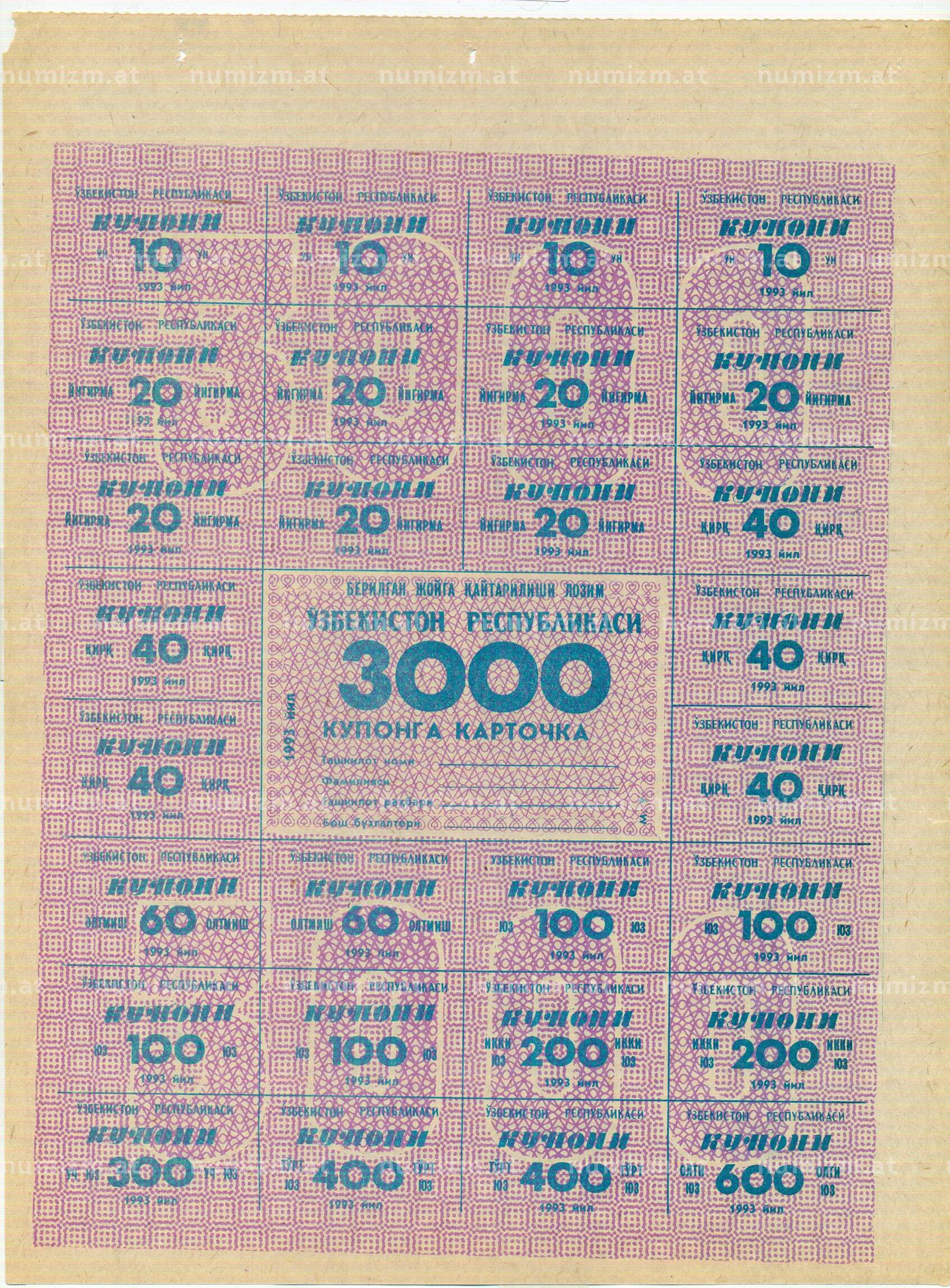 Банкнота Карточка на 3000 купонов 1993 года Узбекистан (Артикул: K12-73338): подробные характеристики, качественные фотографии в высоком разрешении, низкая цена.