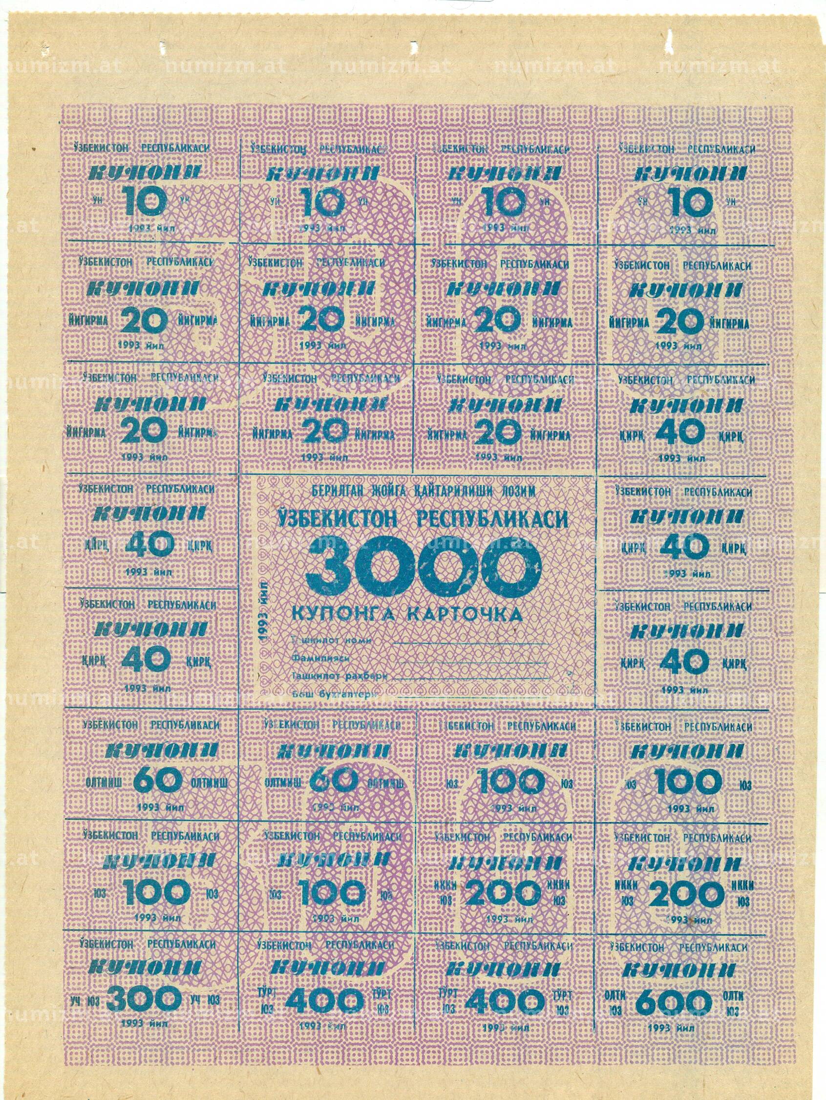 Купить Карточка на 3000 купонов 1993 года Узбекистан по привлекательной цене можно в нашем интернет-магазине — Вам достаточно оформить заказ на сайте. Все монеты, представленные в каталоге, находятся в наличии на нашем складе.