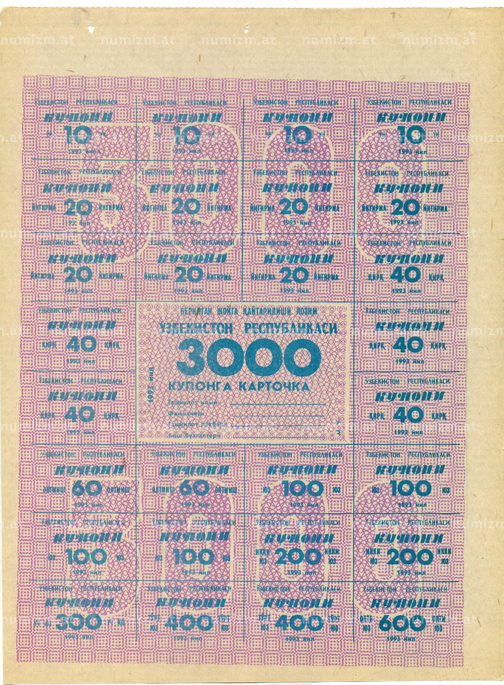 Банкнота Карточка на 3000 купонов 1993 года Узбекистан [Артикул: K12-73342]