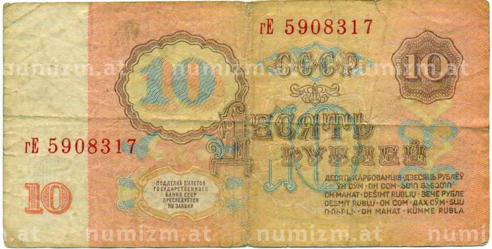 • Банкнота 10 рублей 1961 года (Артикул: K12-74299) — Фото №1 Банкнота 10 рублей 1961 года (Артикул: K12-74299) — Фото №2