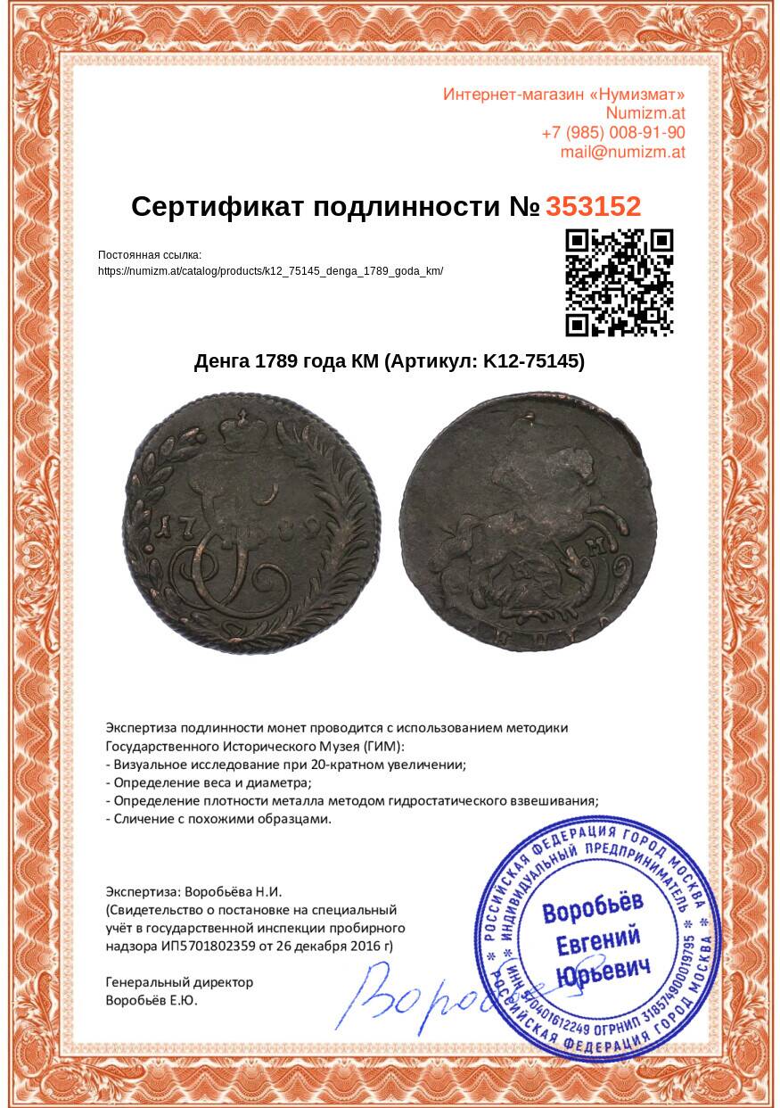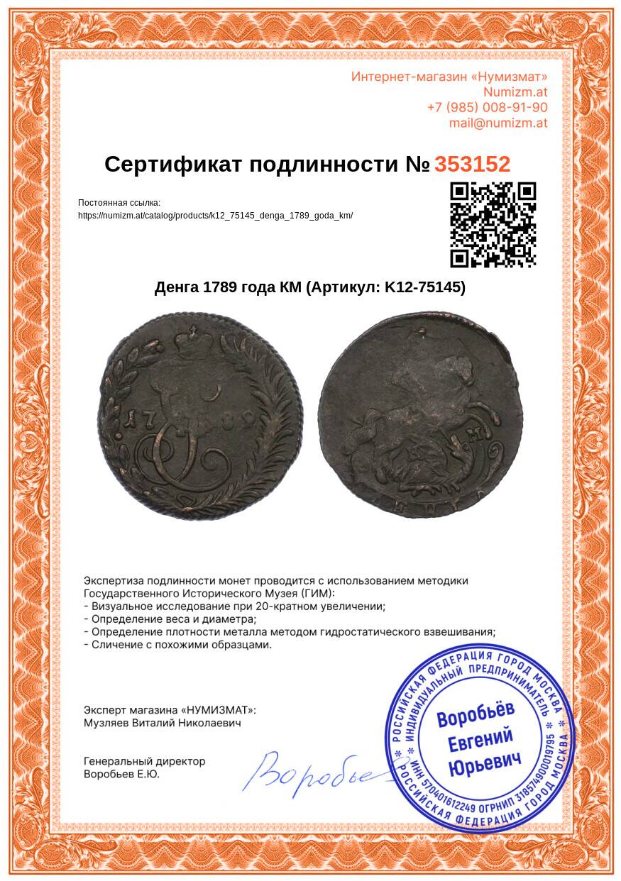 20.01.2025Интернет магазин «Нумизмат» предлагает приобрести Денга 1789 года КМ.