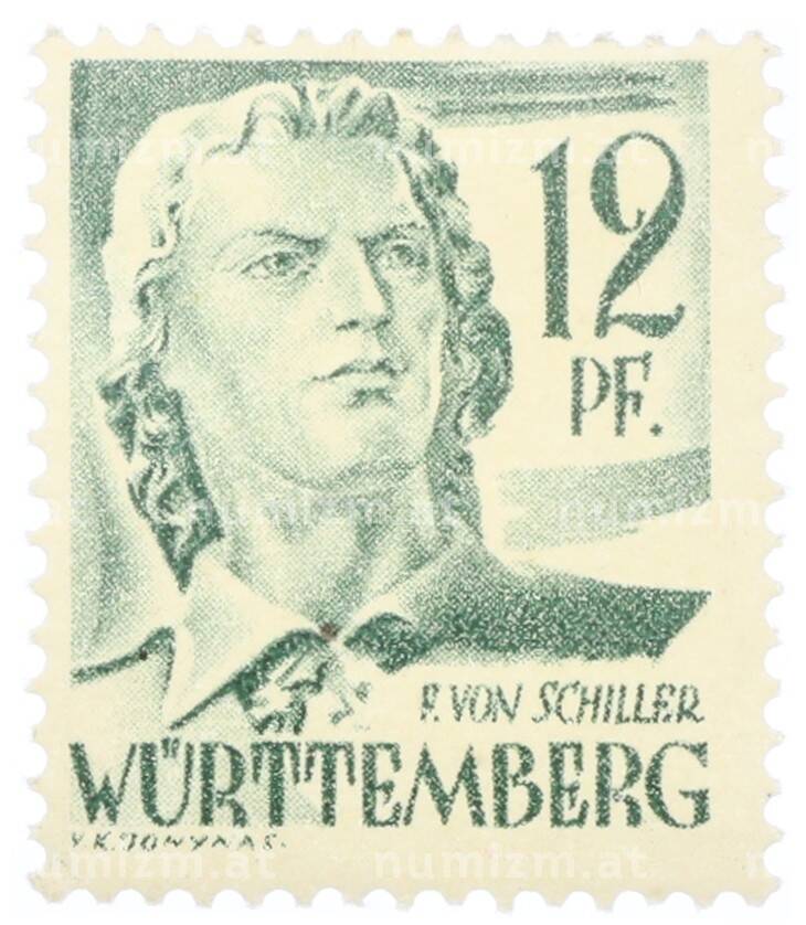 Купить Почтовая марка 12 пфеннигов 1948 года Французская оккупация Вюртемберга «Фридрих Шиллер» по привлекательной цене можно в нашем интернет-магазине — Вам достаточно оформить заказ на сайте. Все монеты, представленные в каталоге, находятся в наличии на нашем складе.