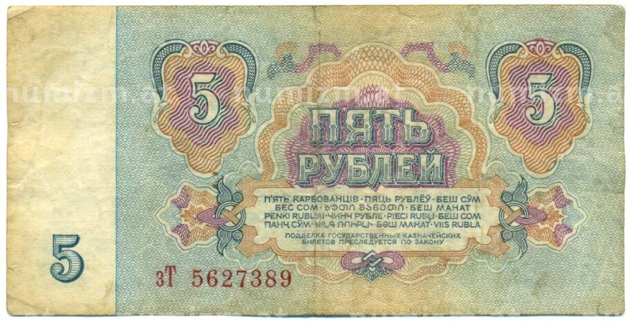 • Банкнота 5 рублей 1961 года (Артикул: K12-76370) — Фото №1 Банкнота 5 рублей 1961 года (Артикул: K12-76370) — Фото №2