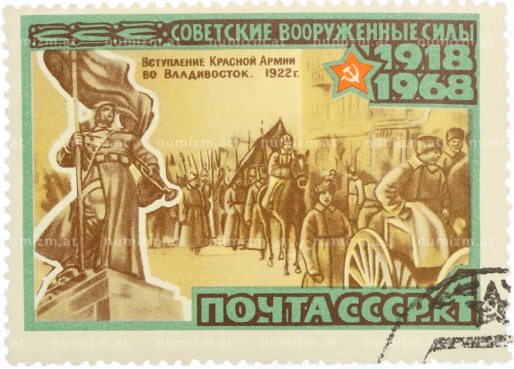 Купить Почтовая марка 4 копейки 1968 года «50 лет Вооруженным Силам СССР — Вступление во Владивосток» по привлекательной цене можно в нашем интернет-магазине — Вам достаточно оформить заказ на сайте. Все монеты, представленные в каталоге, находятся в наличии на нашем складе.