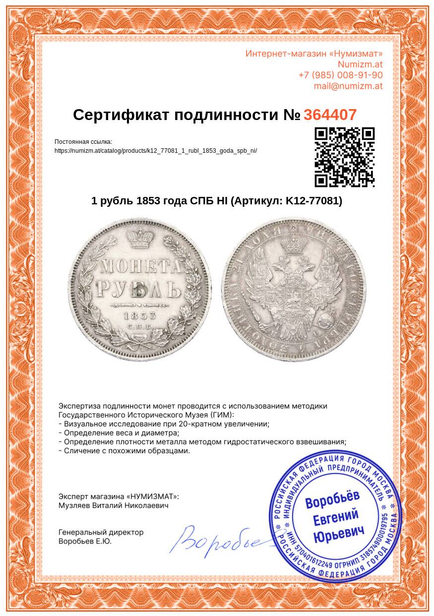 20.01.2025Интернет магазин «Нумизмат» предлагает приобрести 1 рубль 1853 года СПБ НI.