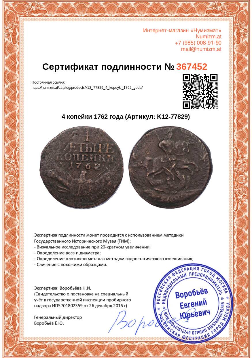 20.01.2025Интернет магазин «Нумизмат» предлагает приобрести 4 копейки 1762 года.