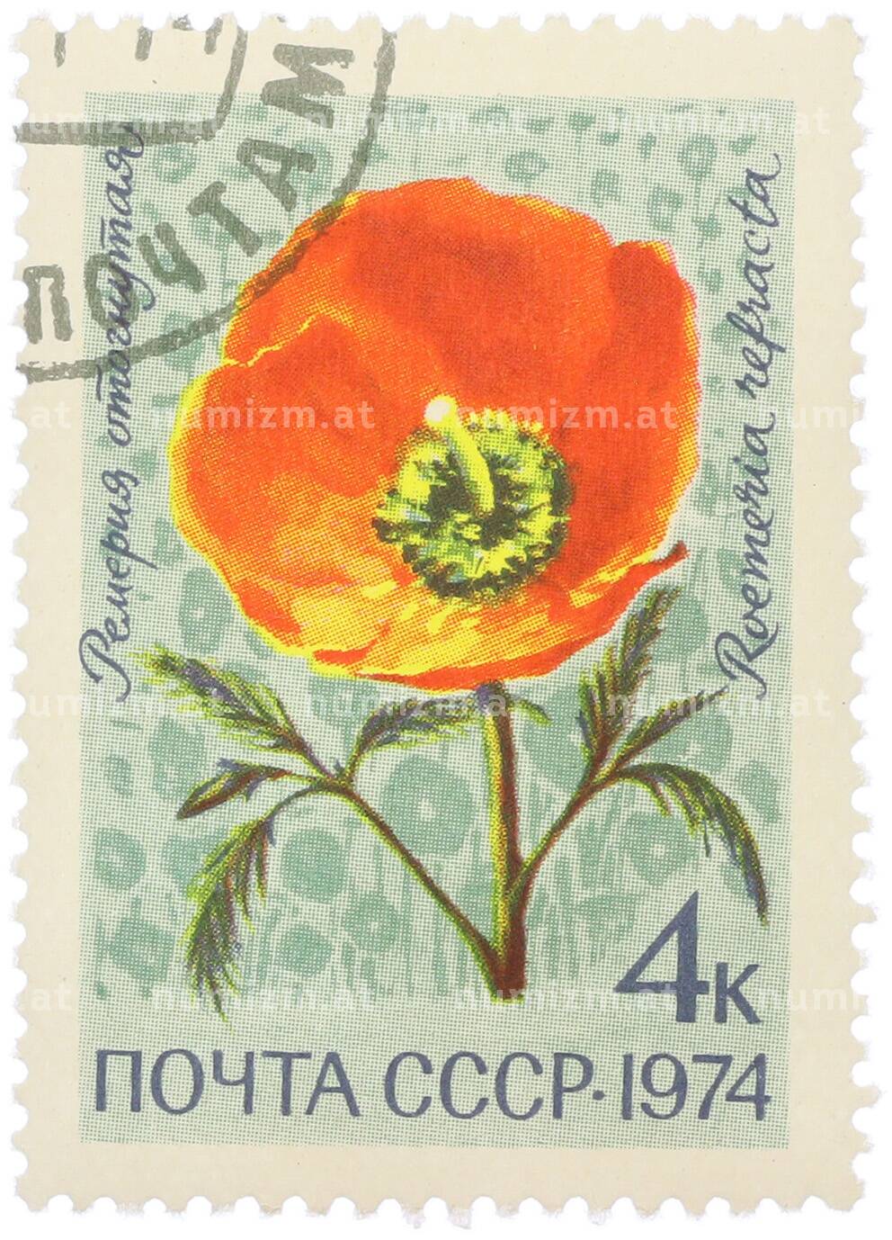 Почтовая марка 4 копейки 1974 года «Цветы альпийских лугов Средней Азии — Ремерия отогнутая» [Артикул: K12-79106]
