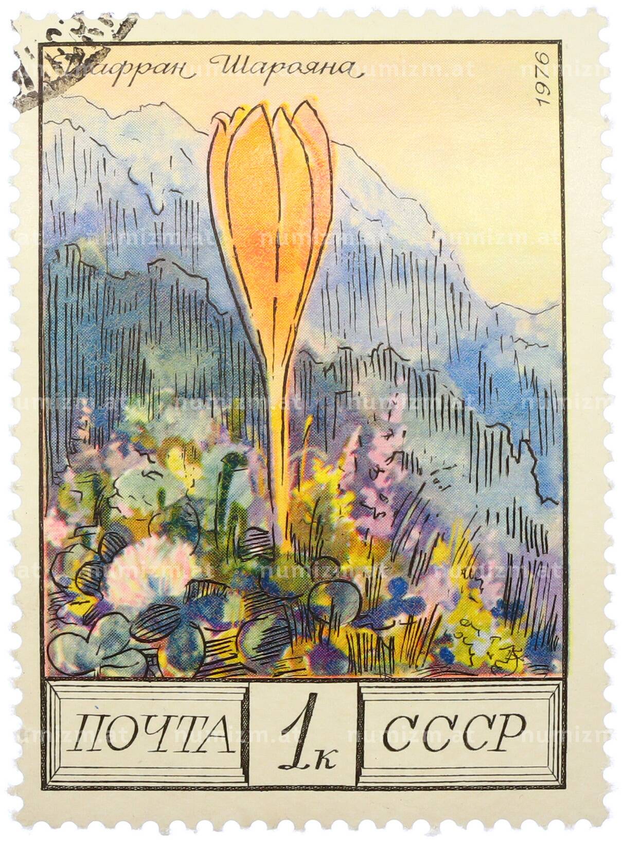Почтовая марка 1 копейка 1976 года «Цветы гор Кавказа — Шафран Шараяна» (Артикул: K12-79322): подробные характеристики, качественные фотографии в высоком разрешении, низкая цена.