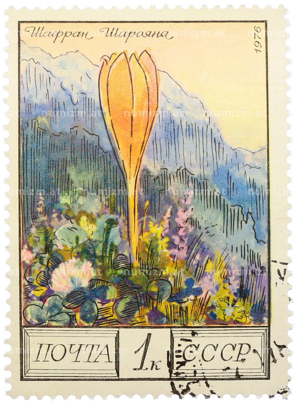 Почтовая марка 1 копейка 1976 года «Цветы гор Кавказа — Шафран Шараяна» (Артикул: K12-79324): подробные характеристики, качественные фотографии в высоком разрешении, низкая цена.