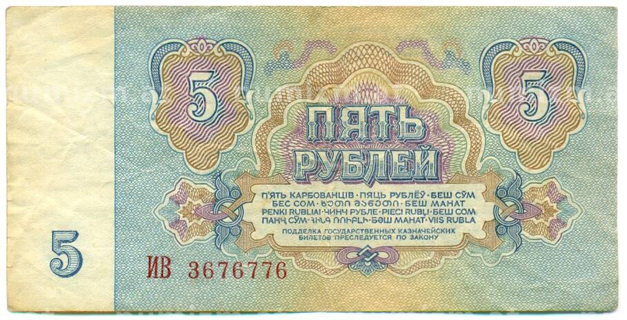 • Банкнота 5 рублей 1961 года (Артикул: K12-79682) — Фото №1 Банкнота 5 рублей 1961 года (Артикул: K12-79682) — Фото №2
