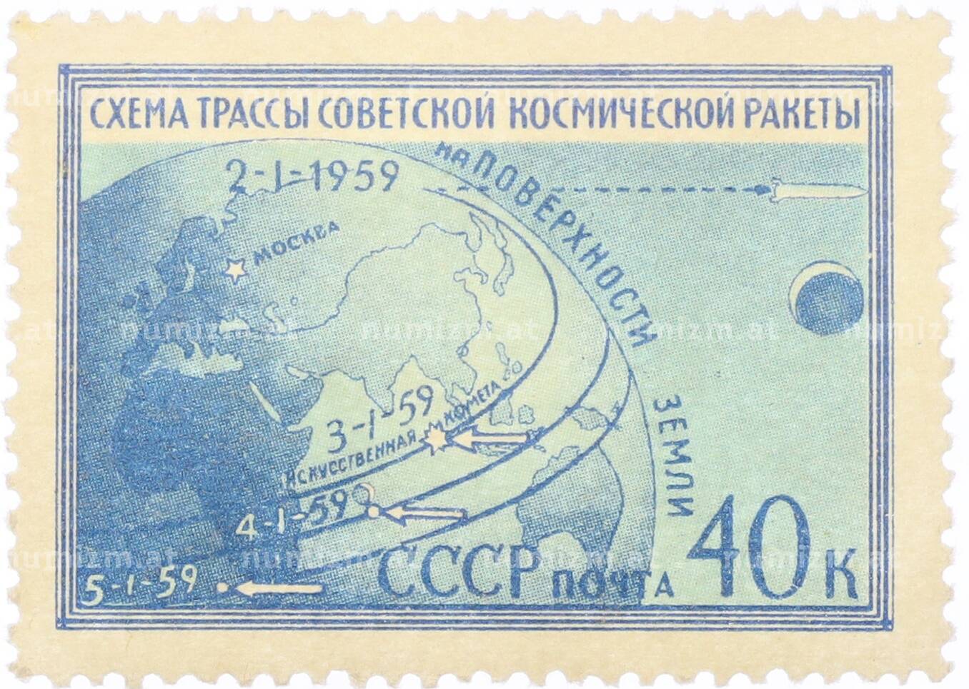 20.01.2025Интернет магазин «Нумизмат» предлагает приобрести Почтовая марка 40 копеек 1959 года «Первая советская космическая ракета запущенная в сторону Луны — Схема трассы ракеты».