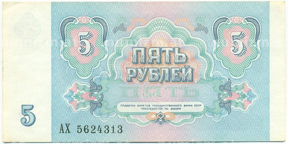 • Банкнота 5 рублей 1991 года (Артикул: K12-81328) — Фото №1 Банкнота 5 рублей 1991 года (Артикул: K12-81328) — Фото №2