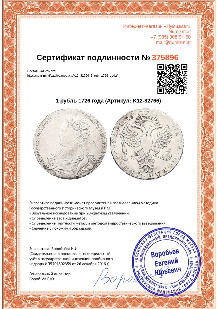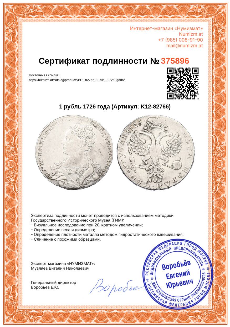 Купить 1 рубль 1726 года по привлекательной цене можно в нашем интернет-магазине — Вам достаточно оформить заказ на сайте. Все монеты, представленные в каталоге, находятся в наличии на нашем складе.