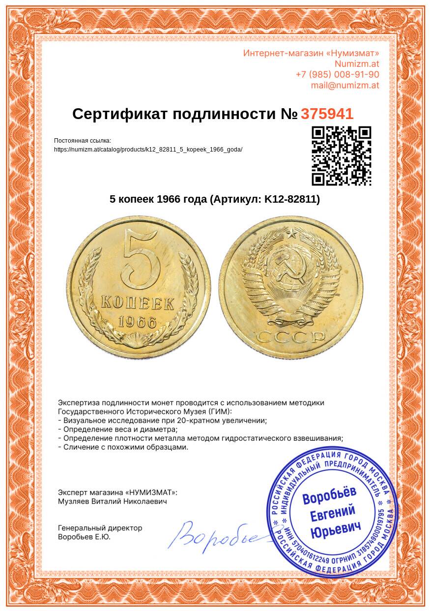 20.01.2025Интернет магазин «Нумизмат» предлагает приобрести 5 копеек 1966 года.