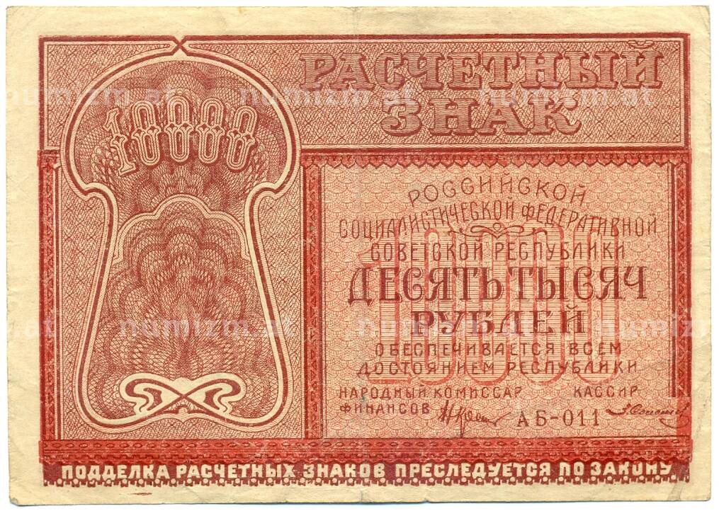 20.01.2025Интернет магазин «Нумизмат» предлагает приобрести 10000 рублей 1921 года.