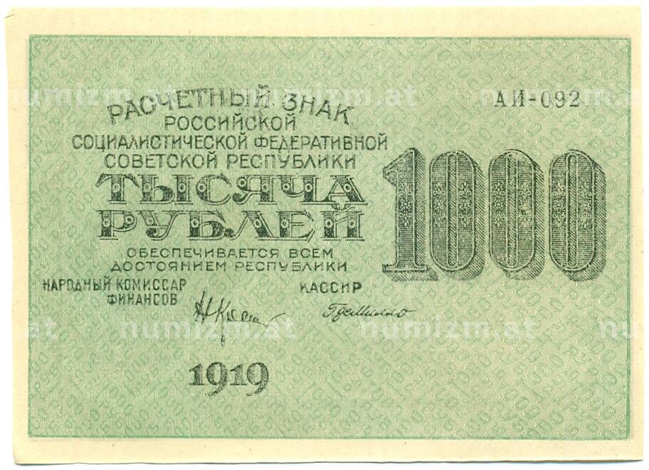 Банкнота 1000 рублей 1919 года (Артикул: K12-84093): подробные характеристики, качественные фотографии в высоком разрешении, низкая цена.