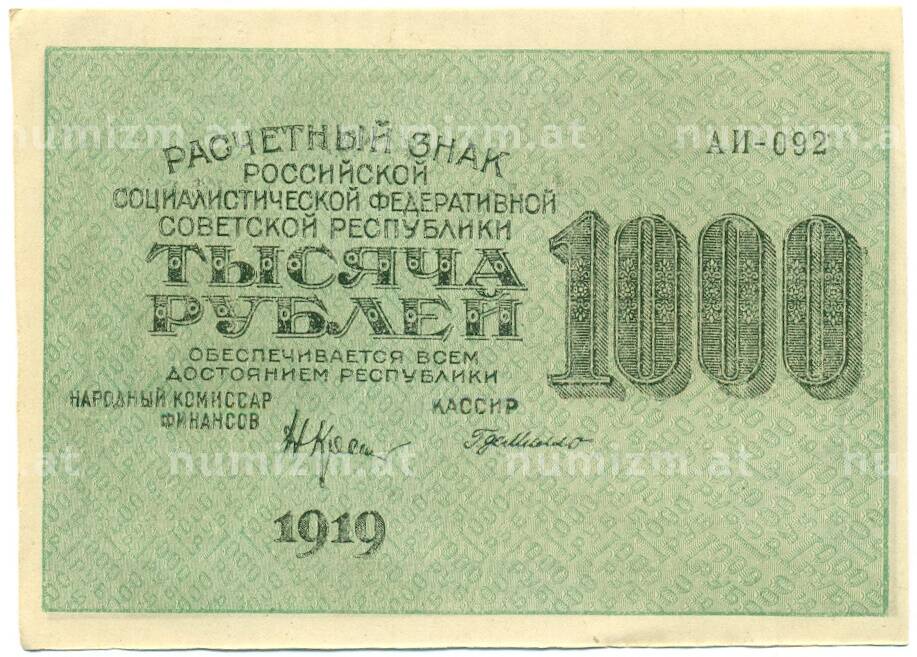20.01.2025Интернет магазин «Нумизмат» предлагает приобрести 1000 рублей 1919 года.