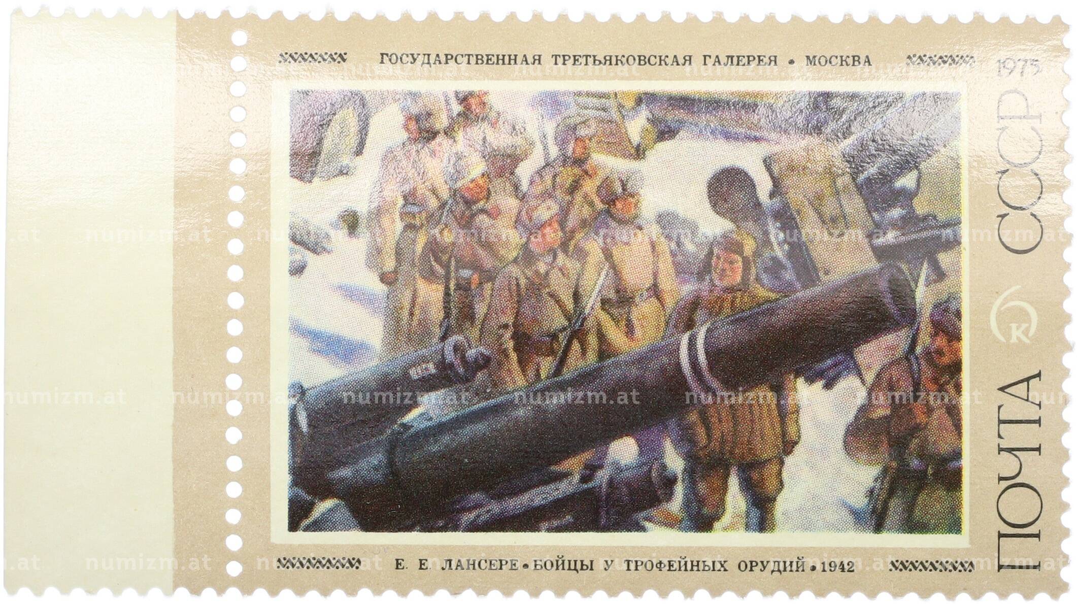 20.01.2025Интернет магазин «Нумизмат» предлагает приобрести Почтовая марка 6 копеек 1975 года «Советская живопись — Бойцы у трофейных орудий».