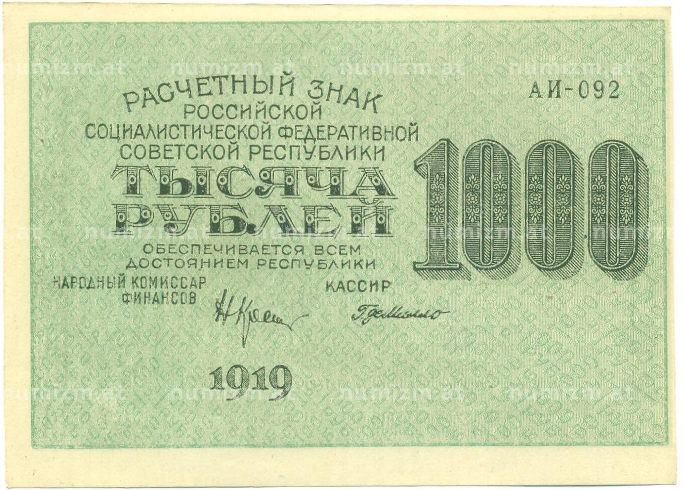 Банкнота 1000 рублей 1919 года (Артикул: K12-87064): подробные характеристики, качественные фотографии в высоком разрешении, низкая цена.