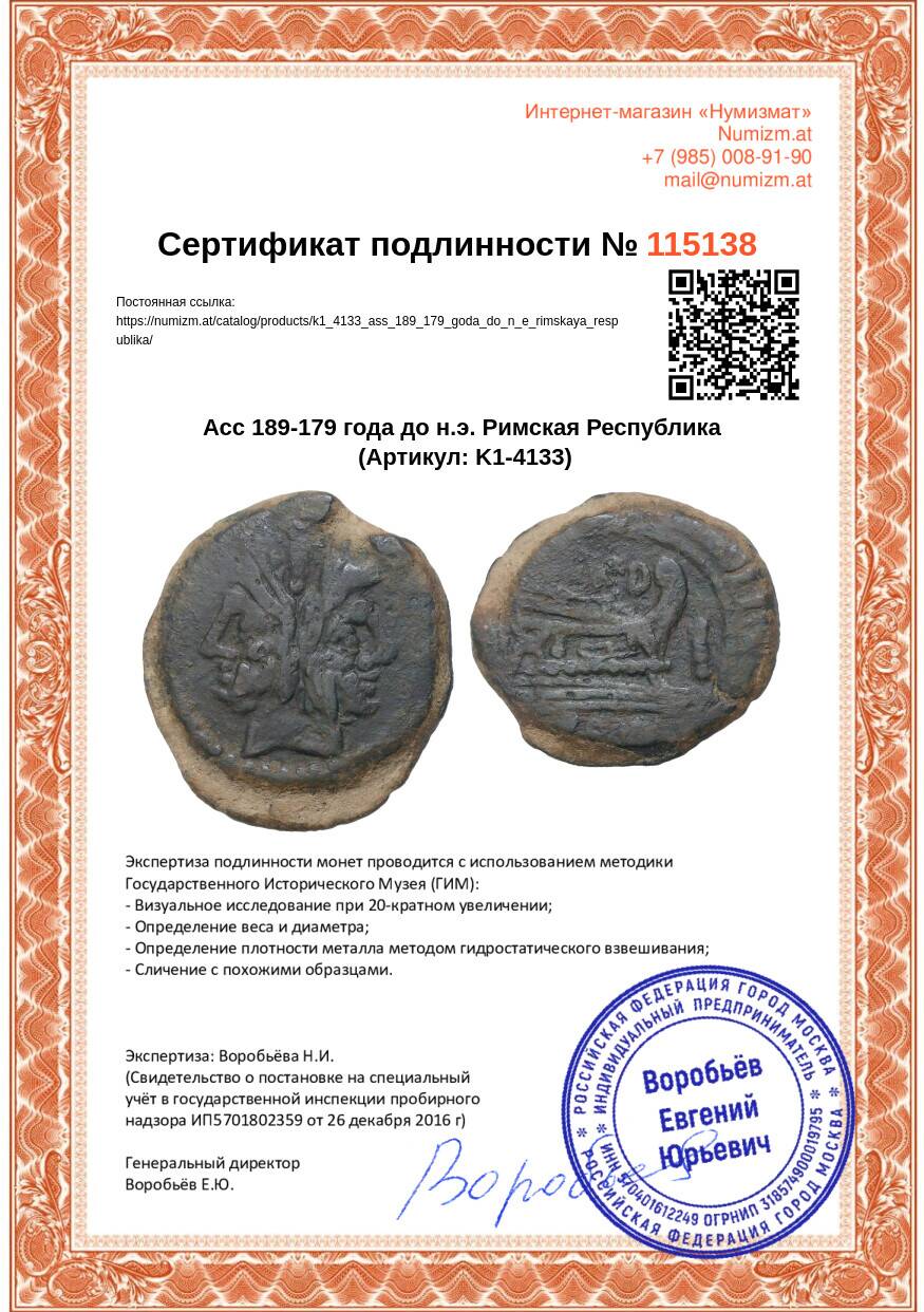 20.01.2025Интернет магазин «Нумизмат» предлагает приобрести Асс 189-179 года до н.э. Римская Республика.