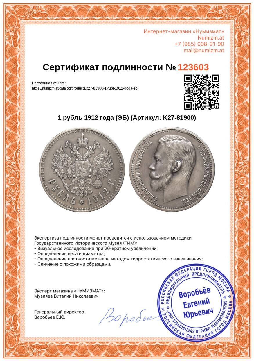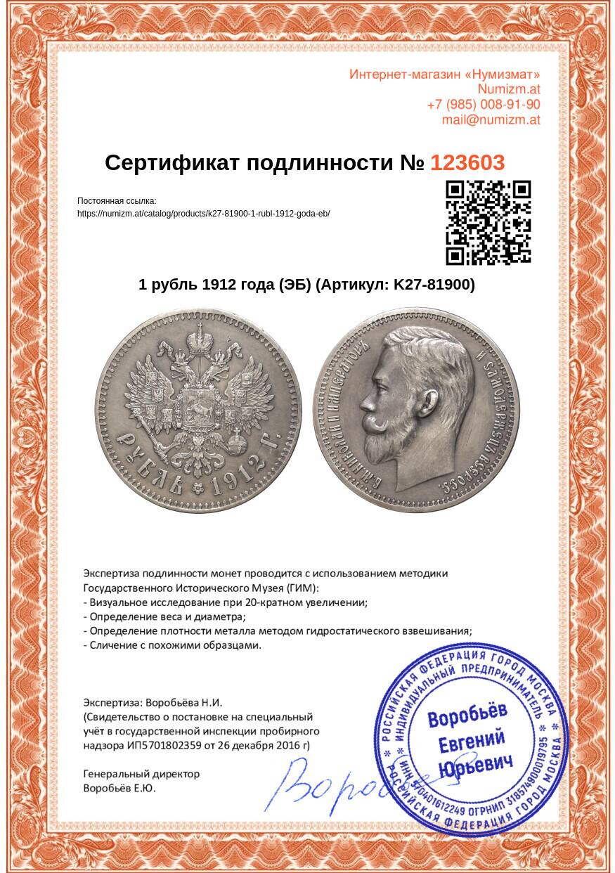 Купить 1 рубль 1912 года (ЭБ) по привлекательной цене можно в нашем интернет-магазине — Вам достаточно оформить заказ на сайте. Все монеты, представленные в каталоге, находятся в наличии на нашем складе.