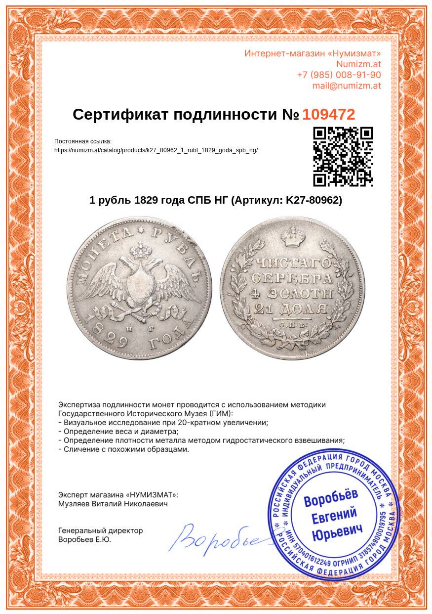 20.01.2025Интернет магазин «Нумизмат» предлагает приобрести 1 рубль 1829 года СПБ НГ.