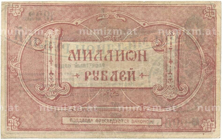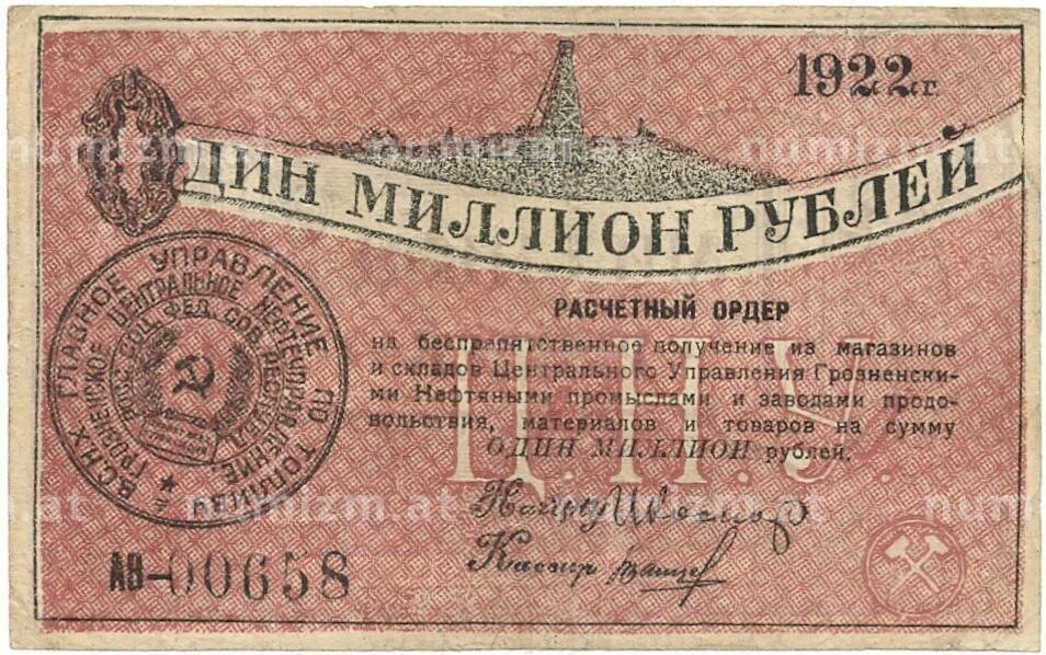 20.01.2025Интернет магазин «Нумизмат» предлагает приобрести 1 миллион рублей 1922 года Центральное управление грозненскими нефтяными промыслами.