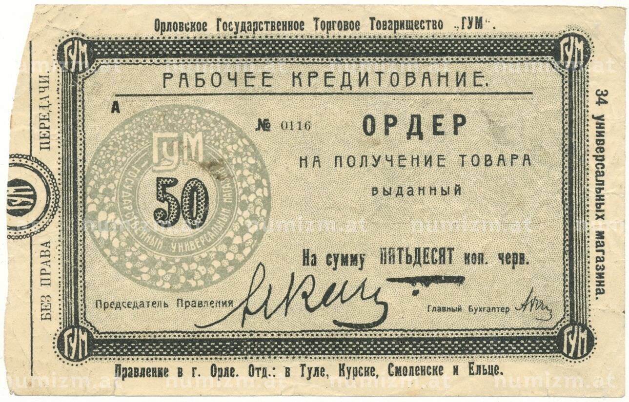 Купить 50 копеек 1920 года Орловское государственное торговое товарищество «ГУМ» по привлекательной цене можно в нашем интернет-магазине — Вам достаточно оформить заказ на сайте. Все монеты, представленные в каталоге, находятся в наличии на нашем складе.