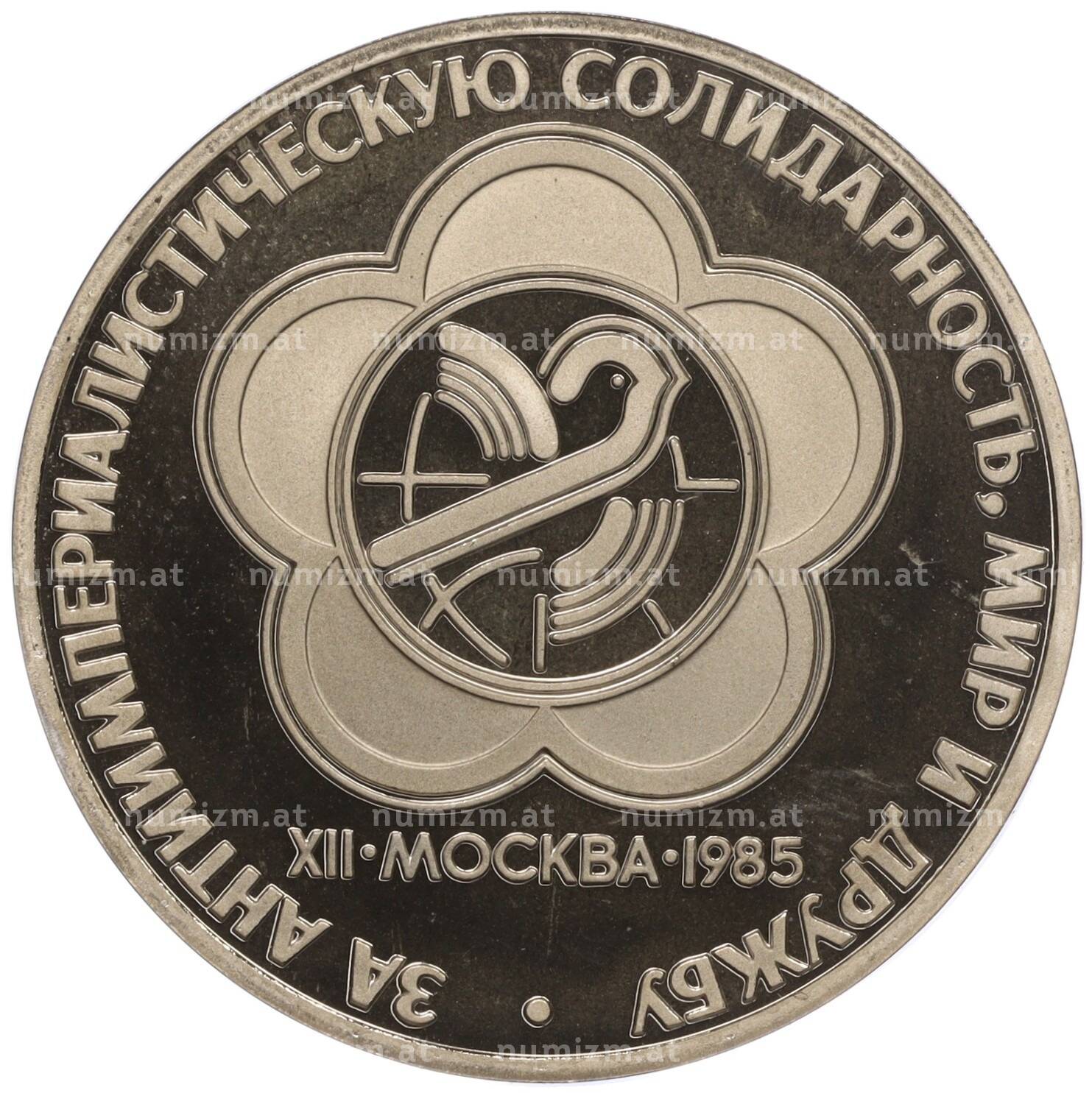 Интернет магазин «Нумизмат» предлагает приобрести 1 рубль 1985 года «XII Международный фестиваль молодежи и студентов в Москве» (Новодел).
