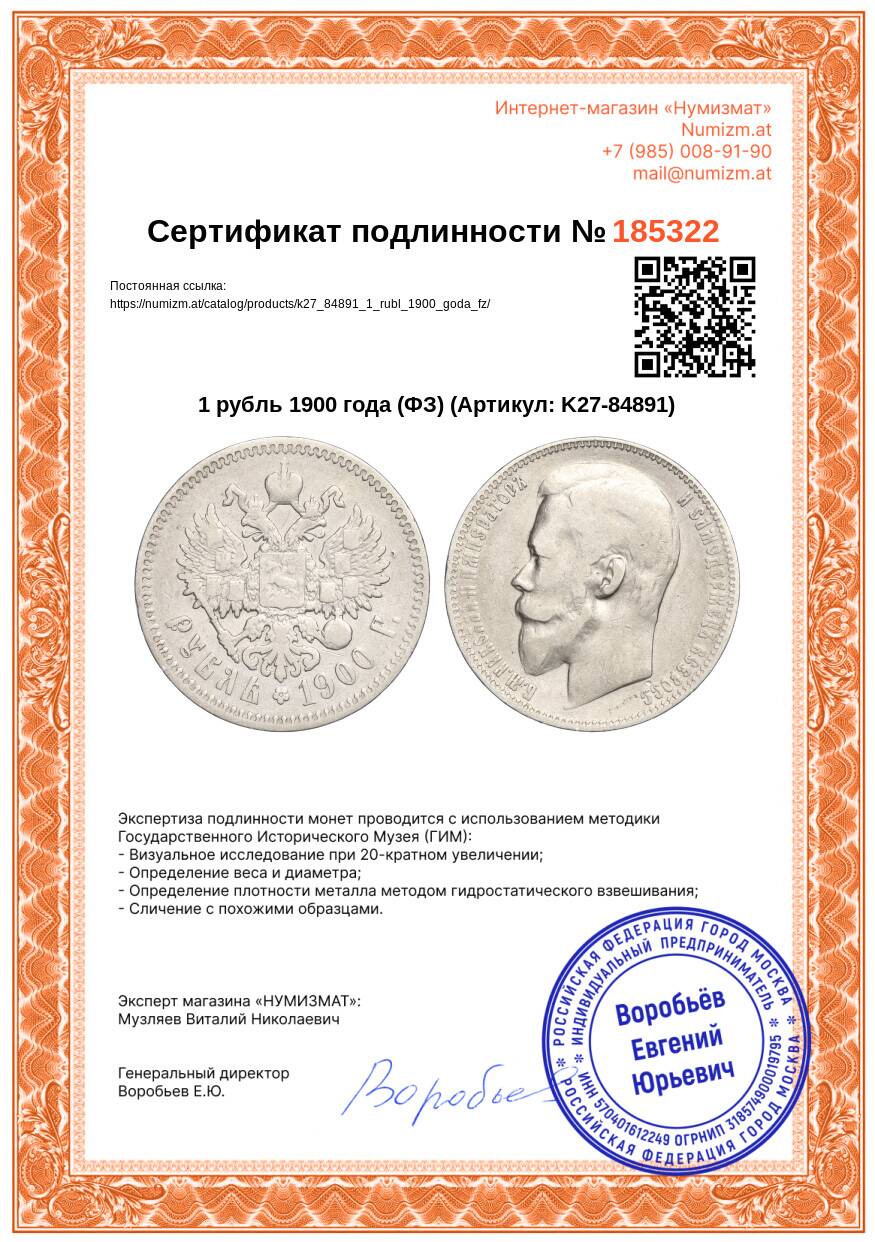 20.01.2025Интернет магазин «Нумизмат» предлагает приобрести 1 рубль 1900 года (ФЗ).
