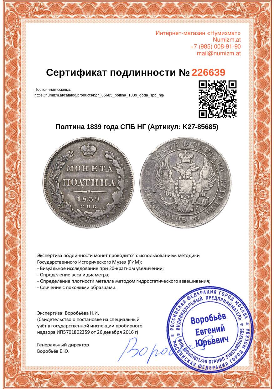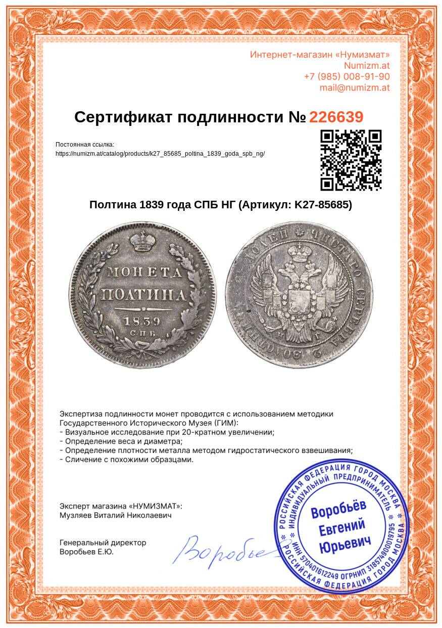 Купить Полтина 1839 года СПБ НГ по привлекательной цене можно в нашем интернет-магазине — Вам достаточно оформить заказ на сайте. Все монеты, представленные в каталоге, находятся в наличии на нашем складе.