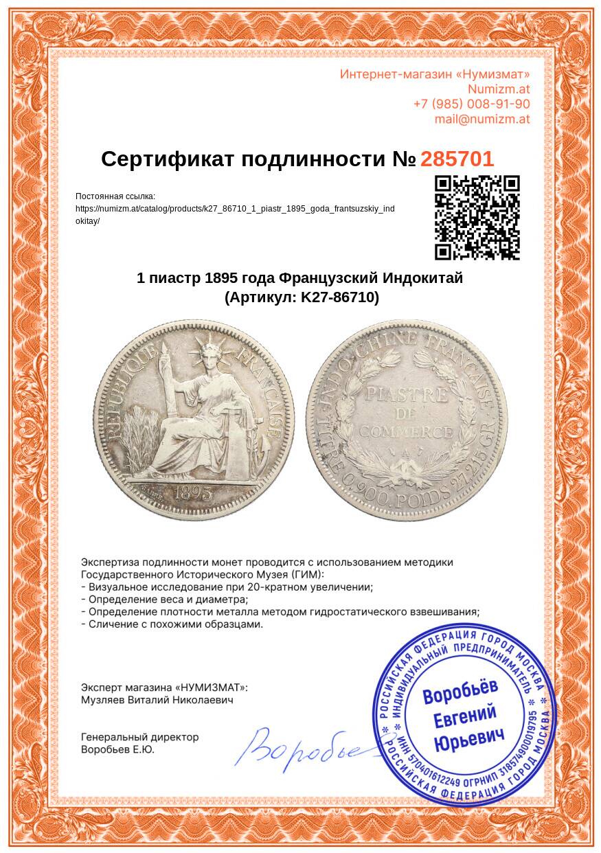 20.01.2025Интернет магазин «Нумизмат» предлагает приобрести 1 пиастр 1895 года Французский Индокитай.