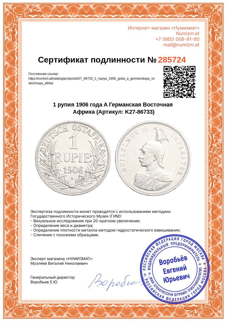 20.01.2025Интернет магазин «Нумизмат» предлагает приобрести 1 рупия 1906 года A Германская Восточная Африка.