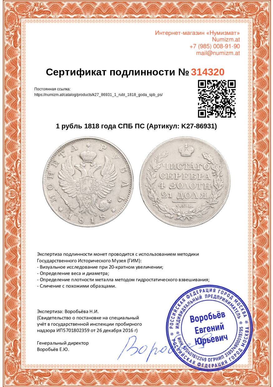 20.01.2025Интернет магазин «Нумизмат» предлагает приобрести 1 рубль 1818 года СПБ ПС.