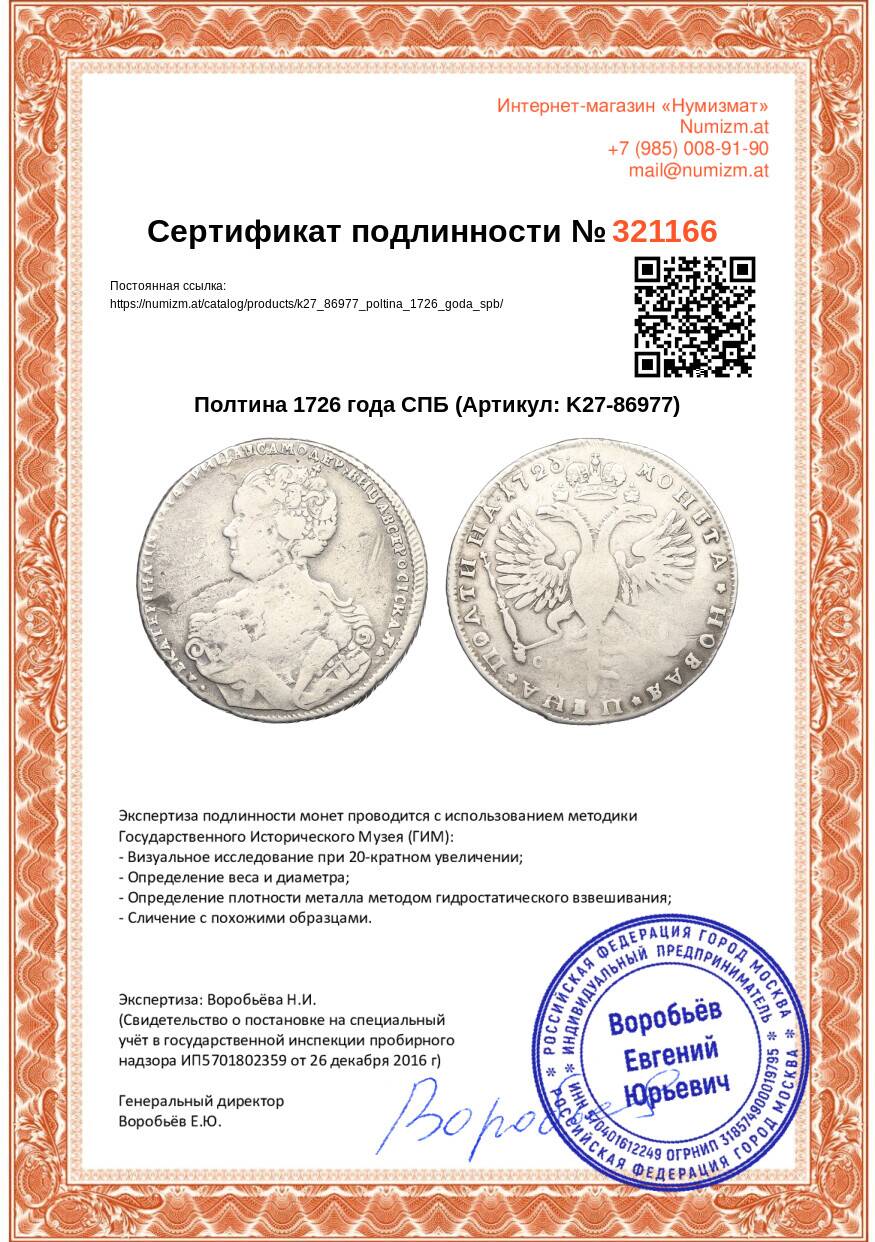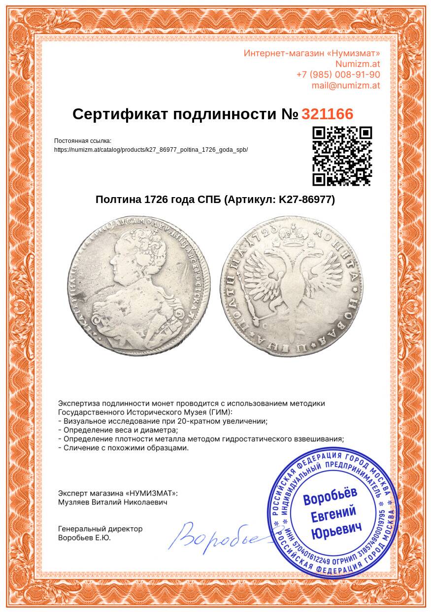 20.01.2025Интернет магазин «Нумизмат» предлагает приобрести Полтина 1726 года СПБ.
