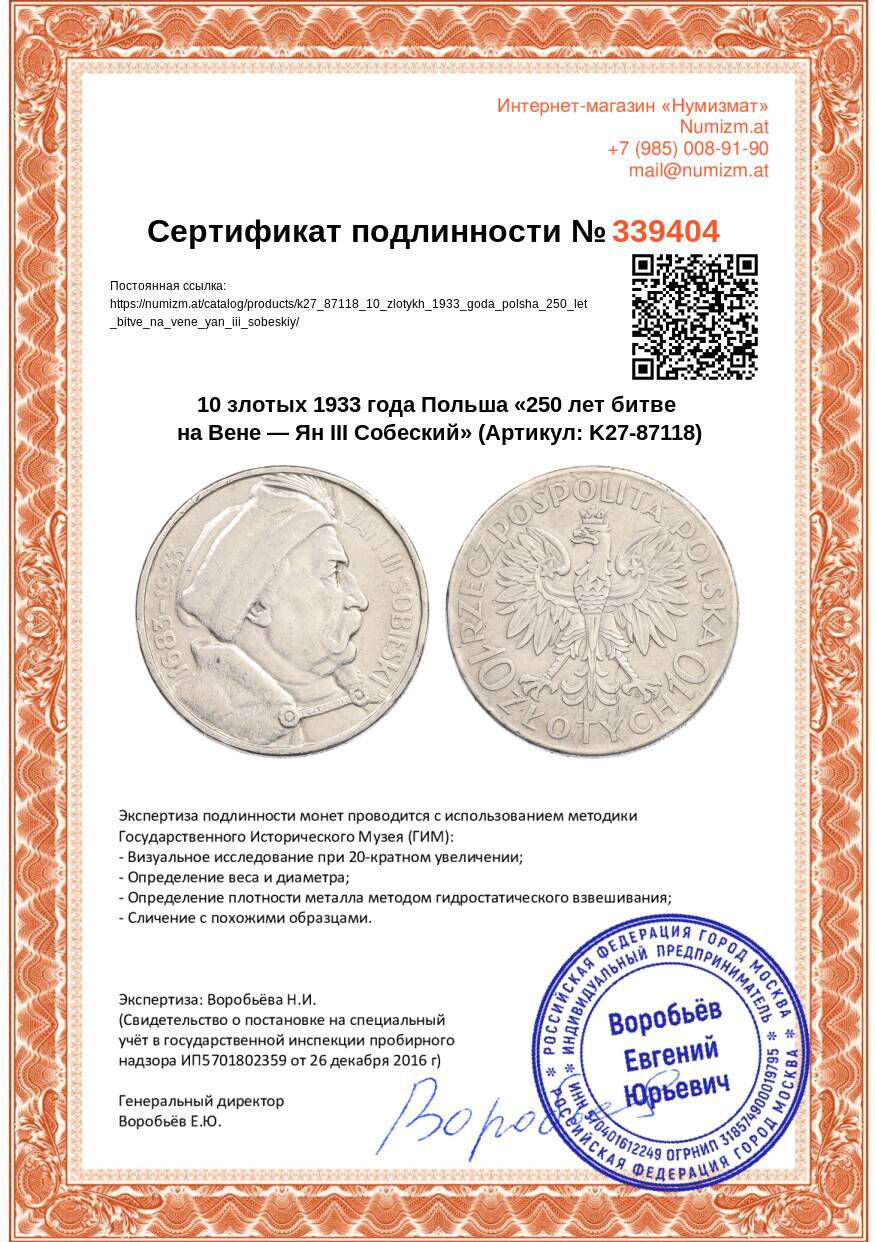 20.01.2025Интернет магазин «Нумизмат» предлагает приобрести 10 злотых 1933 года Польша «250 лет битве на Вене — Ян III Собеский».