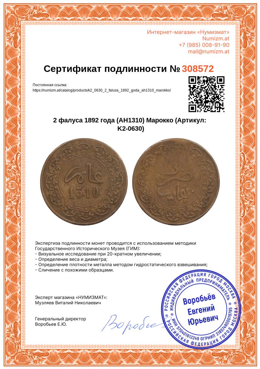 20.01.2025Интернет магазин «Нумизмат» предлагает приобрести 2 фалуса 1892 года (AH1310) Марокко.