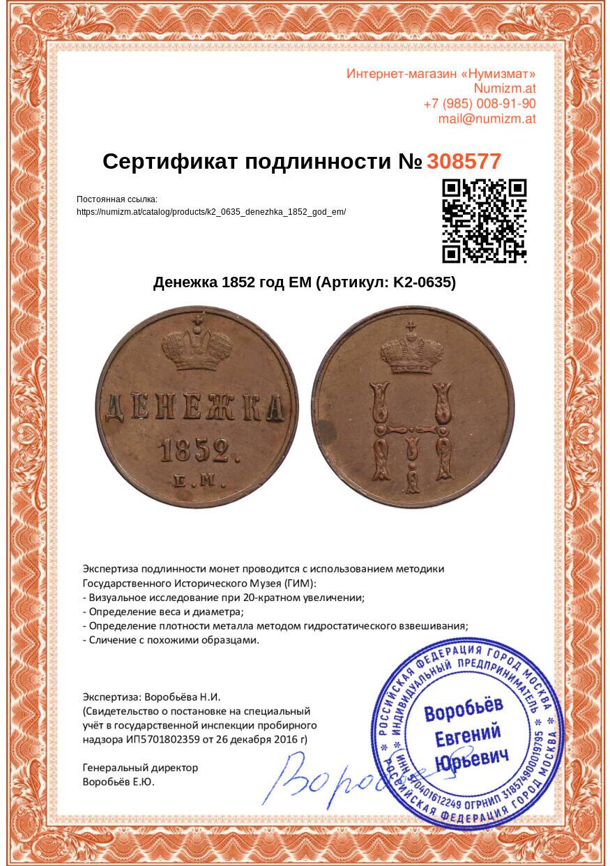 Купить Денежка 1852 год ЕМ по привлекательной цене можно в нашем интернет-магазине — Вам достаточно оформить заказ на сайте. Все монеты, представленные в каталоге, находятся в наличии на нашем складе.