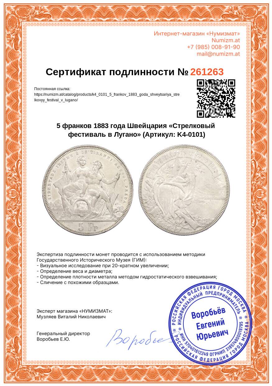 20.01.2025Интернет магазин «Нумизмат» предлагает приобрести 5 франков 1883 года Швейцария «Стрелковый фестиваль в Лугано».