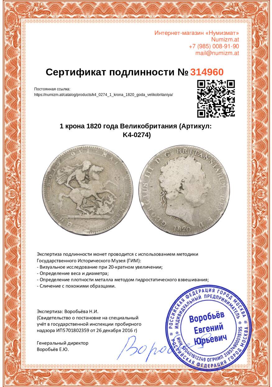 Купить 1 крона 1820 года Великобритания по привлекательной цене можно в нашем интернет-магазине — Вам достаточно оформить заказ на сайте. Все монеты, представленные в каталоге, находятся в наличии на нашем складе.