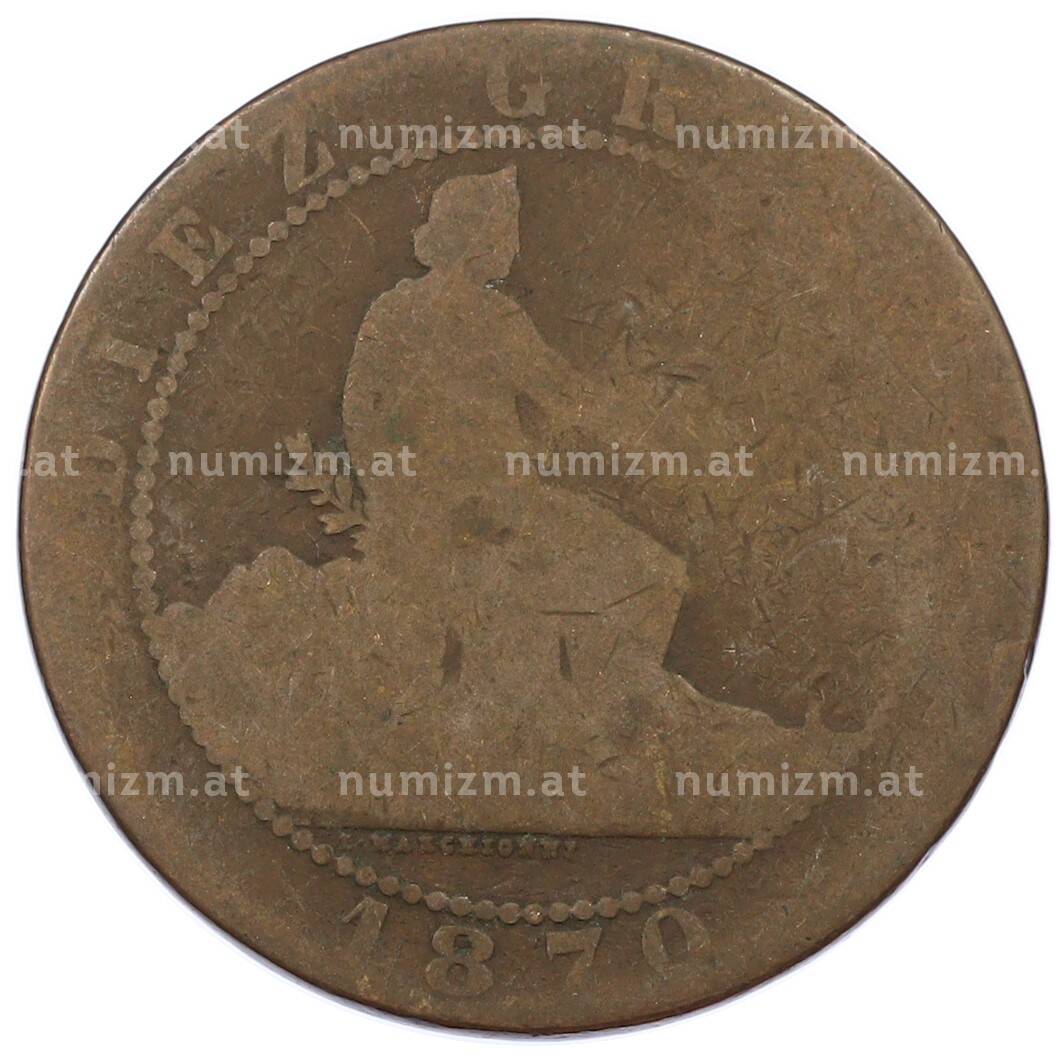 Купить 10 сентимо 1870 года Испания по привлекательной цене можно в нашем интернет-магазине — Вам достаточно оформить заказ на сайте. Все монеты, представленные в каталоге, находятся в наличии на нашем складе.