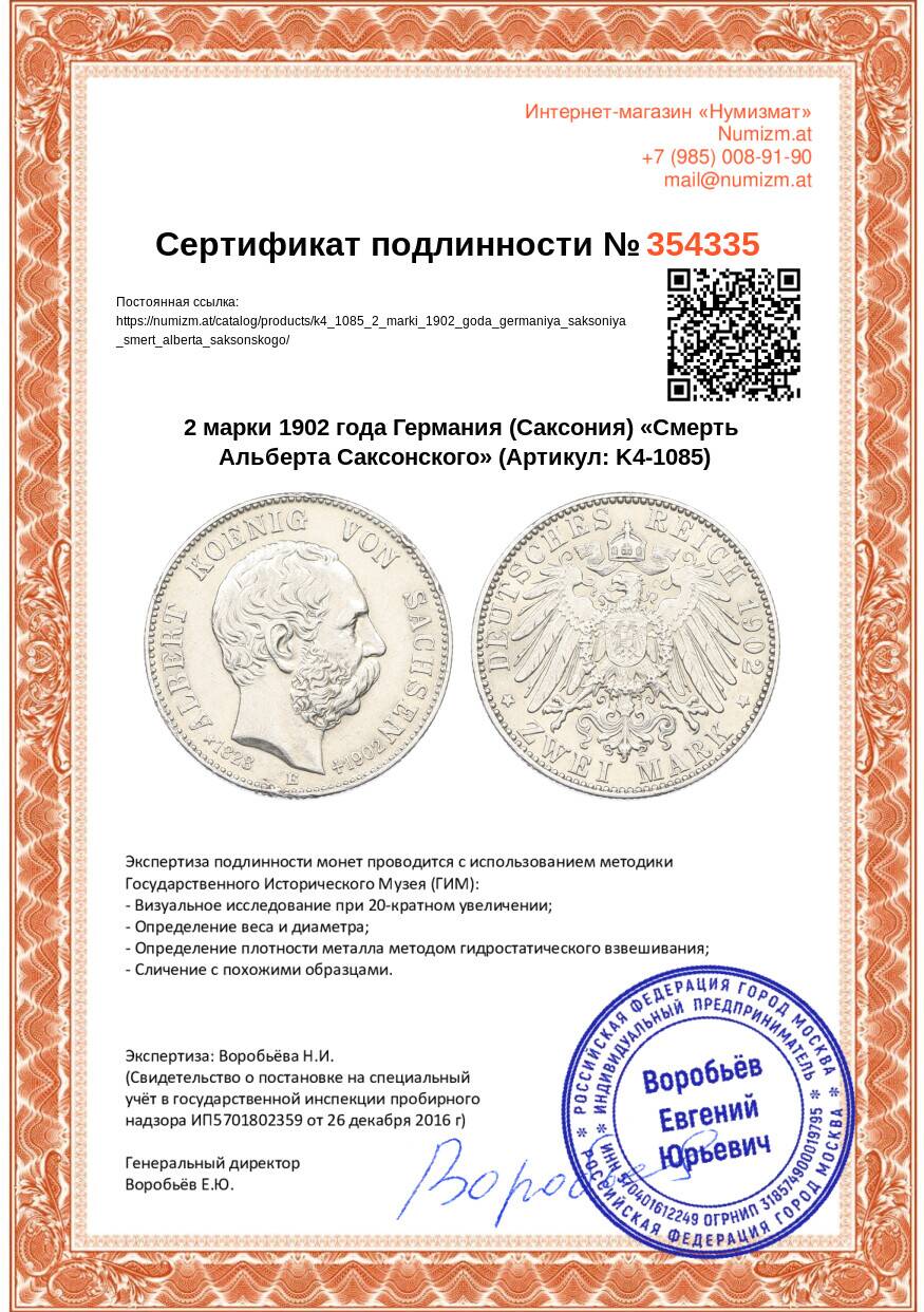 20.01.2025Интернет магазин «Нумизмат» предлагает приобрести 2 марки 1902 года Германия (Саксония) «Смерть Альберта Саксонского».