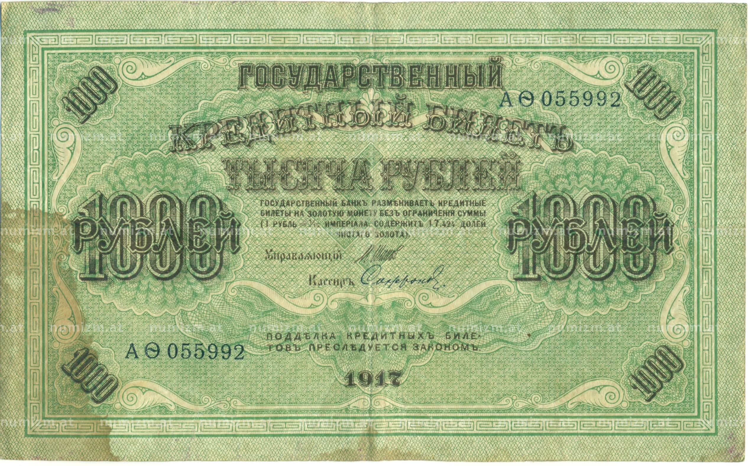 20.01.2025Интернет магазин «Нумизмат» предлагает приобрести 1000 рублей 1917 года.